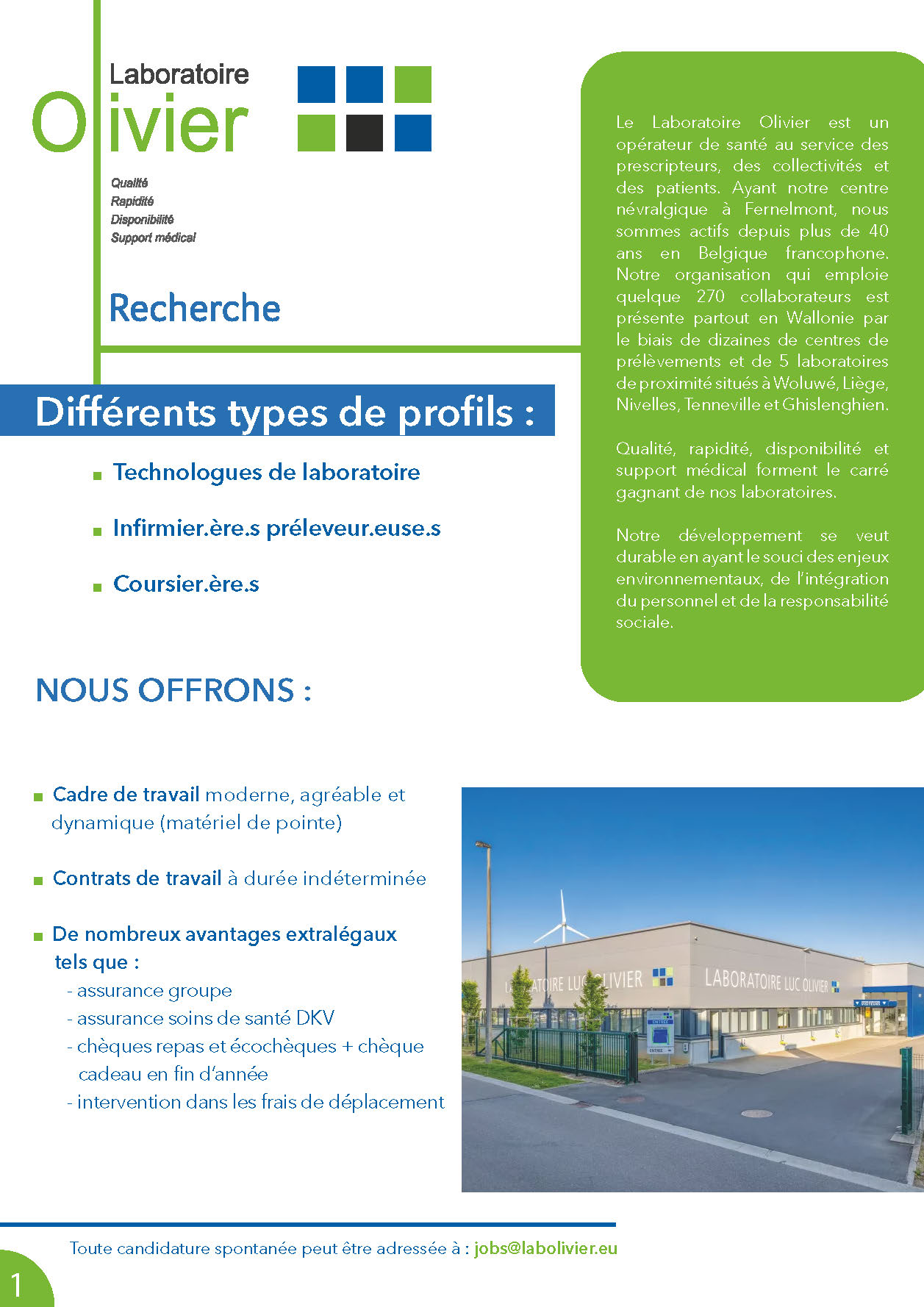 Fort de ses 280 employés, le Laboratoire Olivier couvre toute la Wallonie par le biais de dizaines de centres de prélèvements, de son laboratoire central à Fernelmont (Namur) et de ses 4 laboratoires de proximité (Nivelles, Ghislenghien, Ans et Tenneville).